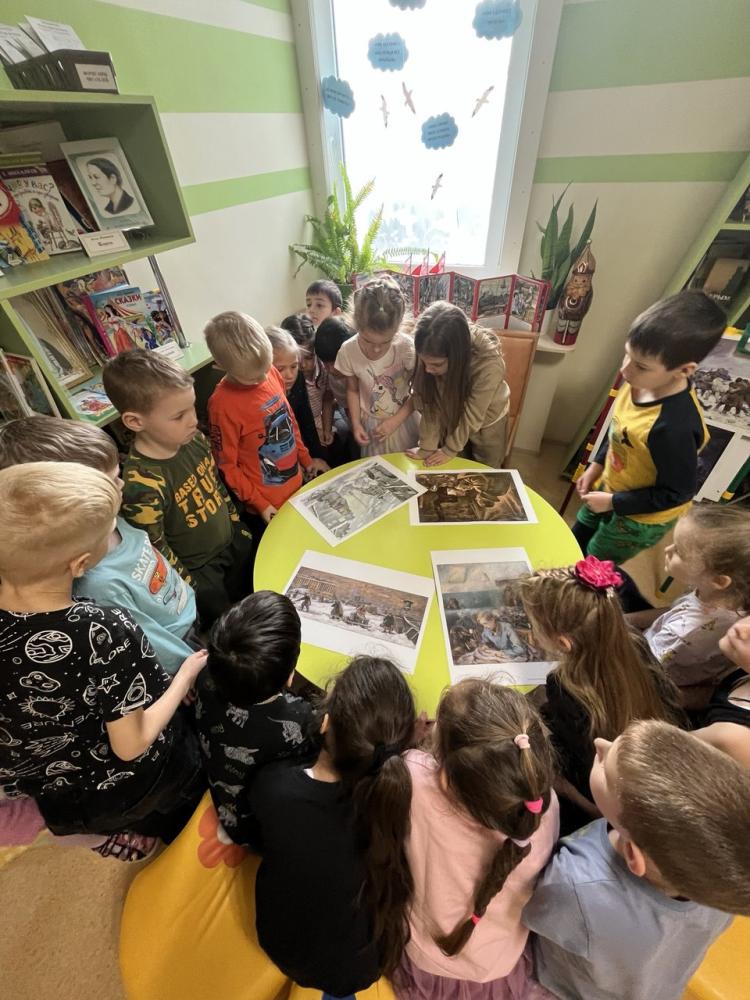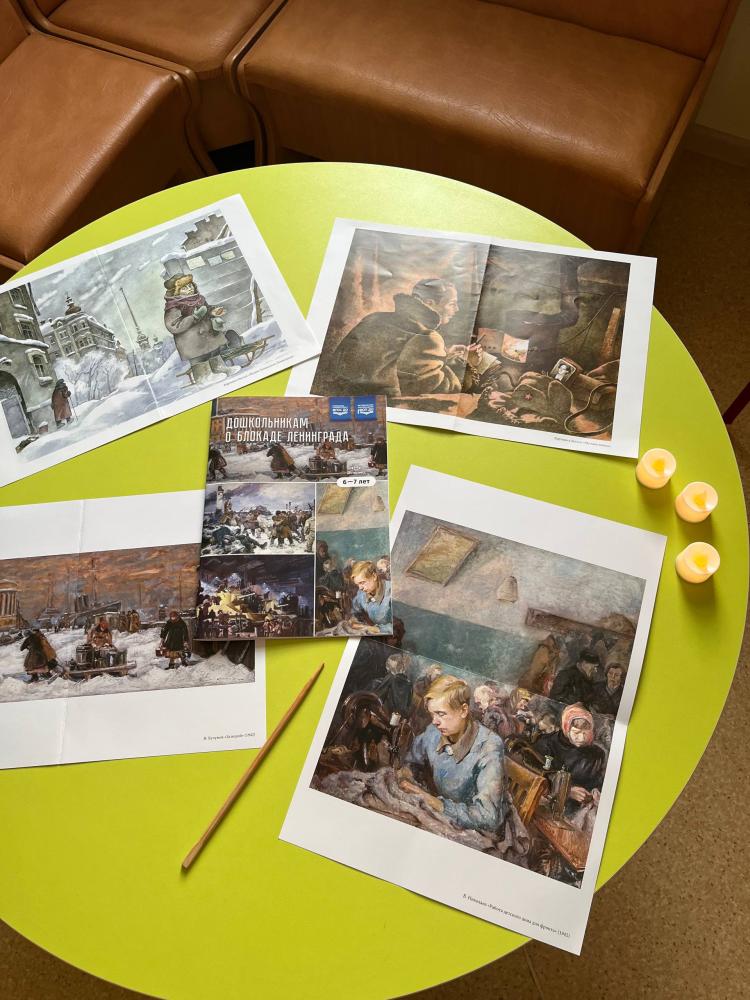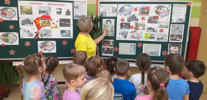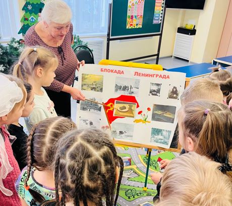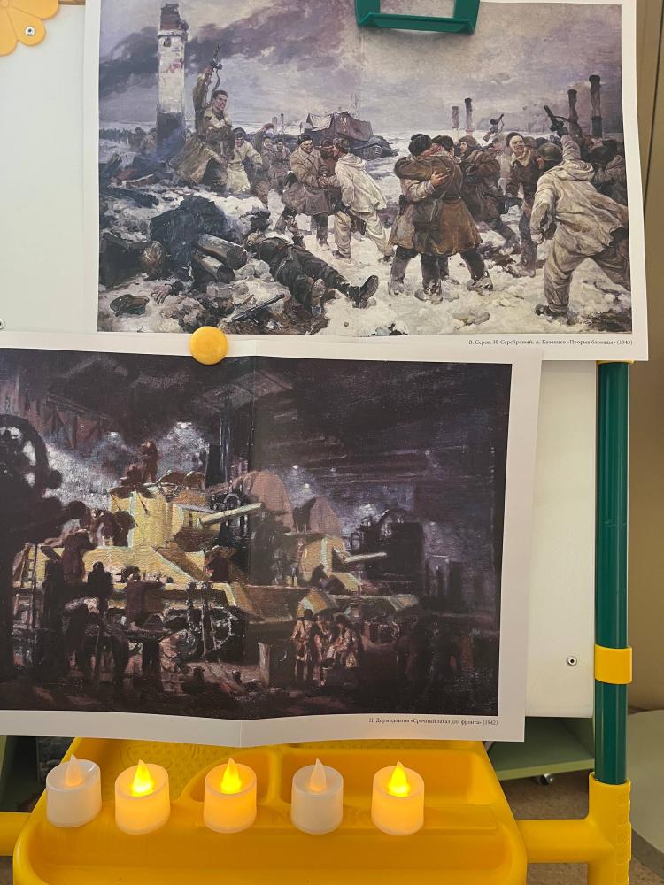 Блокада Ленинграда-один из наиболее трагических периодов в истории Великой Отечественной войны. Для старшего поколения, которое носит в себе это воспоминания,- это часть жизни, которое они никогда не забудут. Ценой своей жизни ленинградцы сохранили духовные и материальные ценности своей страны. Подвиг ленинградцев стал ярким примером стойкости и героизма советского народа в борьбе с фашизмом. 27 января в нашем детском саду со старшими дошкольниками были проведены занятия, приуроченные к этой важной дате. Воспитатели формировали у детей представления о героическом подвиге жителей Ленинграда; чувство патриотизма и умение сопереживать. В библиотеке детского сада оформлена экспозиция «Блокада Ленинграда» которую сегодня посетили старшие дошкольники. Воспитатели провели с детьми беседу о тех суровых днях, о блокадном хлебе, о подвиге защитников Ленинграда, рассказали детям о хлебе, о его роли в жизни ленинградцев в дни блокады, о жизни и занятиях детей в блокадном городе, о «Ленинградской симфонии» Д. Шостаковича и о снятии блокады, наглядно познакомили с «Дорогой жизни», «Карточками на хлеб». Ребята почтили память погибших минутой молчания, зажгли свечи в память о героях блокады Ленинграда.
