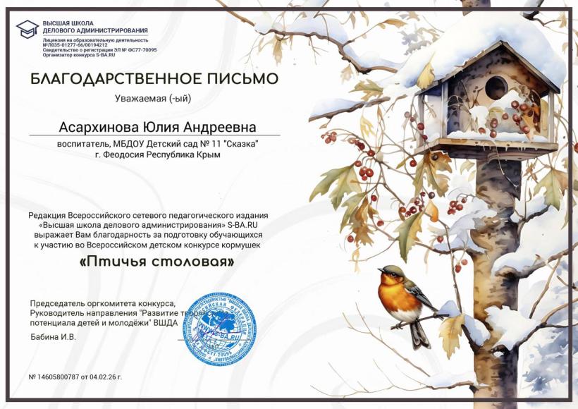Дипломы за победу во Всероссийском детском конкурсе кормушек "Птичья столовая"
