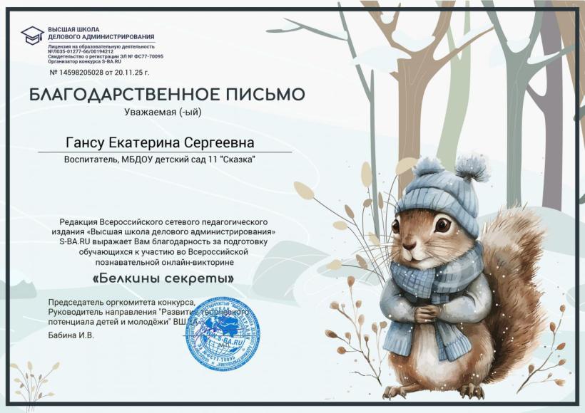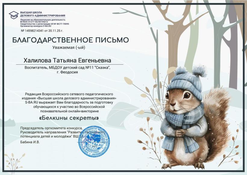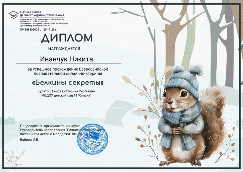 Дипломы за успешное прохождение Всероссийской познавательной онлайн-викторины "Белкина секреты"