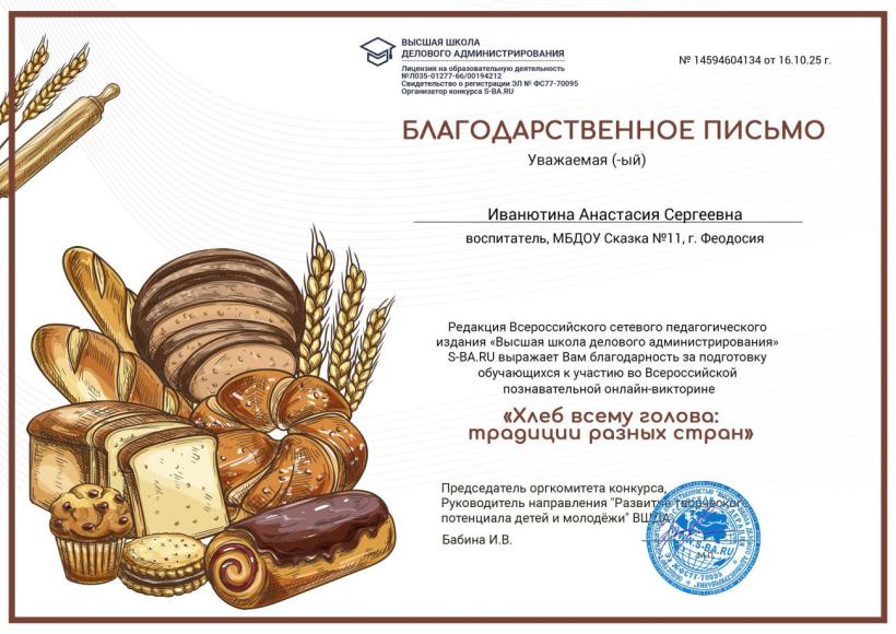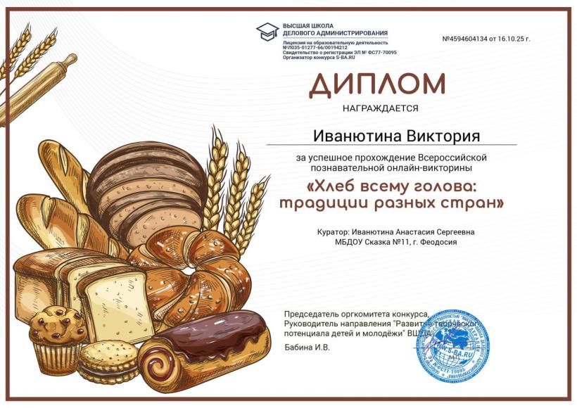 Дипломы за успешное прохождение Всероссийской познавательной онлайн-викторины "Хлеб всему голова: традиции разных стран"
