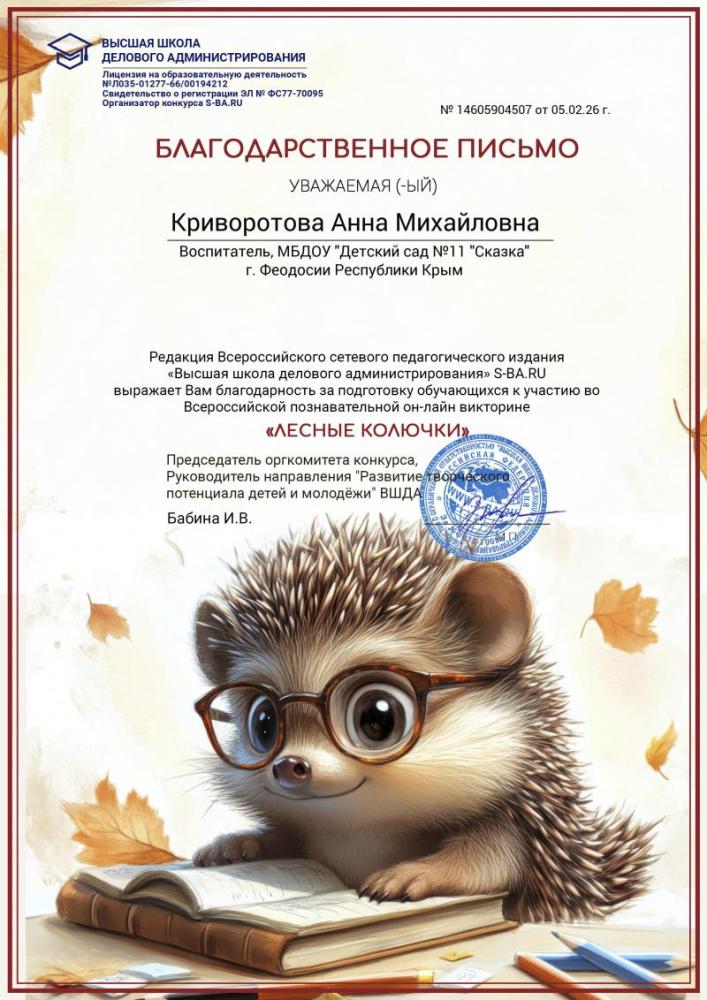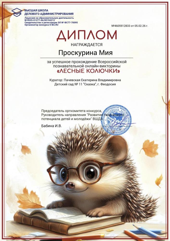 Дипломы за успешное прохождение Всероссийской познавательной онлайн-викторины "Лесные колючки"