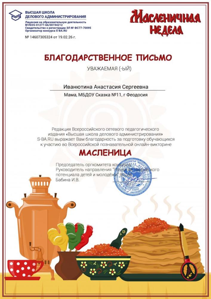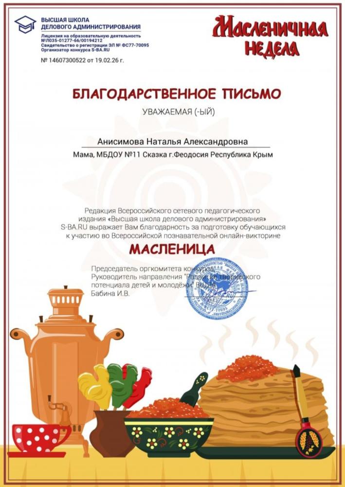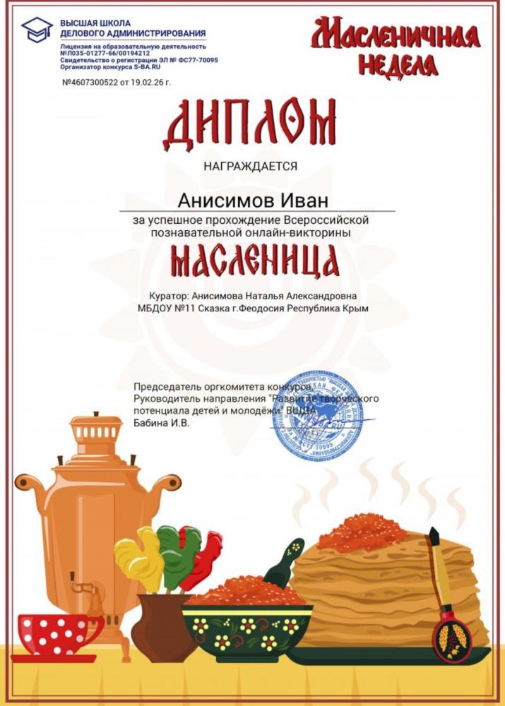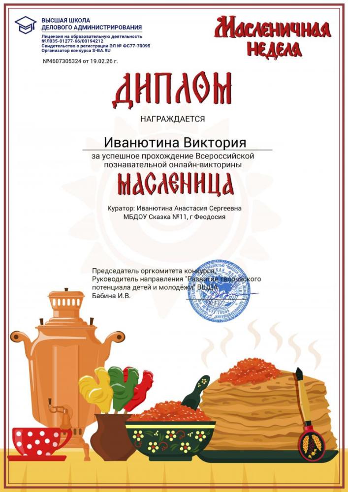 Дипломы за успешное прохождение Всероссийской познавательной онлайн-викторины "Масленица"