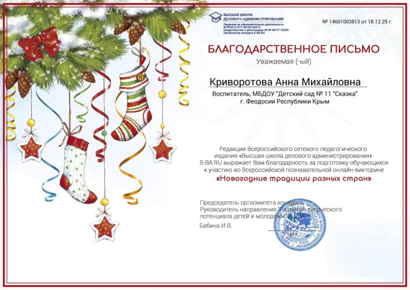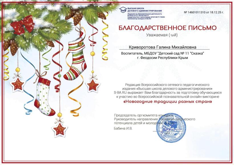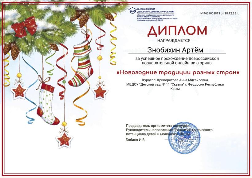 Дипломы за успешное прохождение Всероссийской познавательной онлайн-викторины "Новогодние традиции разных стран"