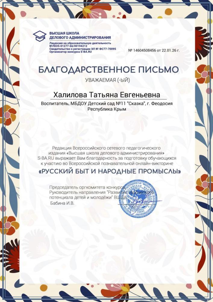 Дипломы за успешное прохождение Всероссийской познавательной онлайн-викторины "Русский быт и народные промыслы"
