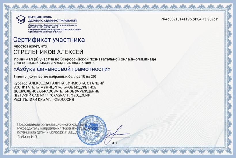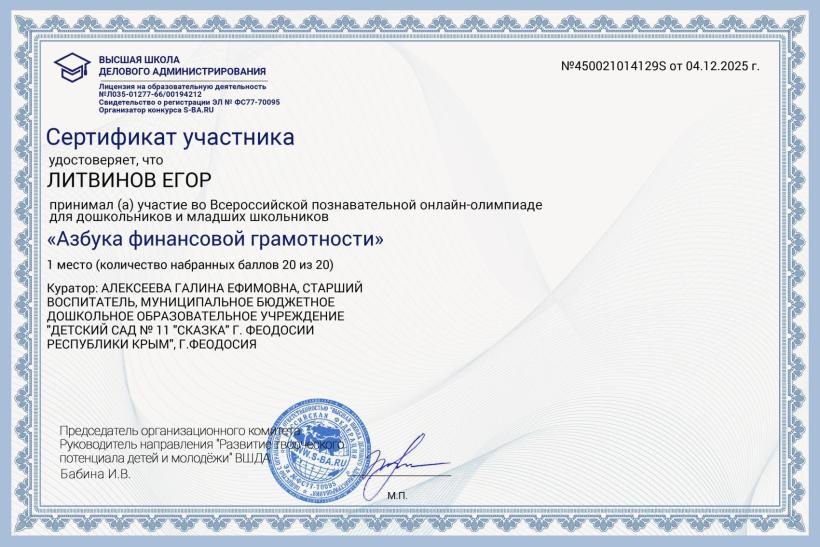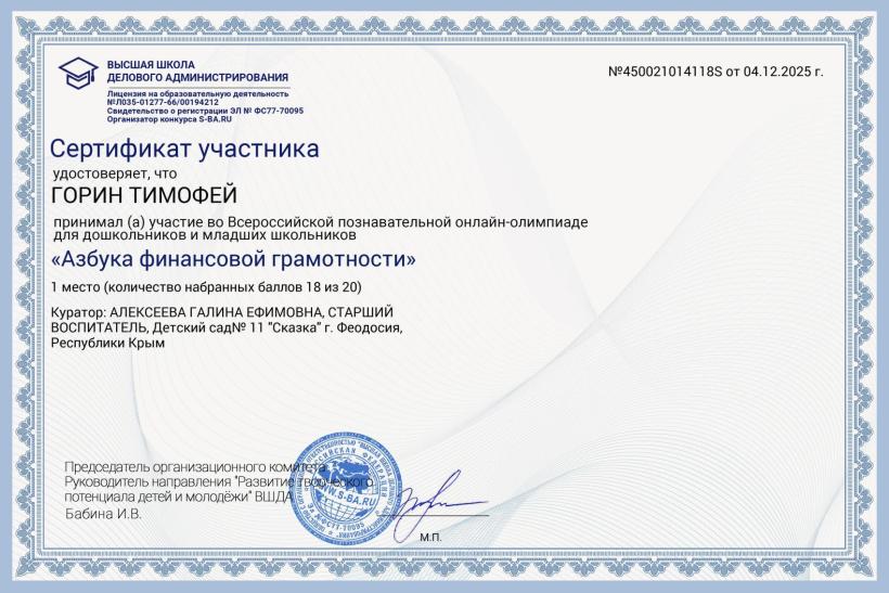 Поздравляем участников Всероссийской познавательной онлайн-олимпиады для дошкольников и младших школьников "Азбука финансовой грамотности"