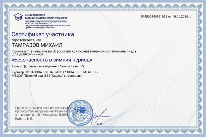 Сертификаты участников Всероссийской познавательной онлайн-олимпиады для дошкольников "Безопасность в зимний период"