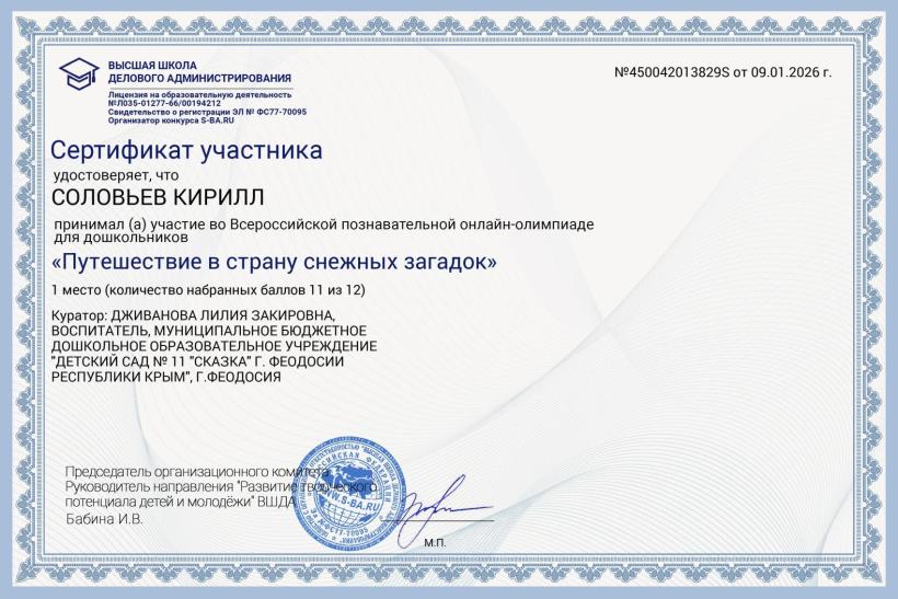 Сертификаты участников Всероссийской познавательной онлайн-олимпиады для дошкольников "Путешествие в страну снежных загадок"