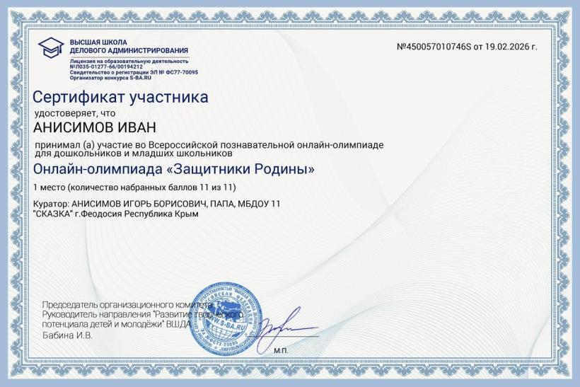 Сертификаты за участие во Всероссийской познавательной онлайн-олимпиаде для дошкольников и младших школьников "Защитники Родины"