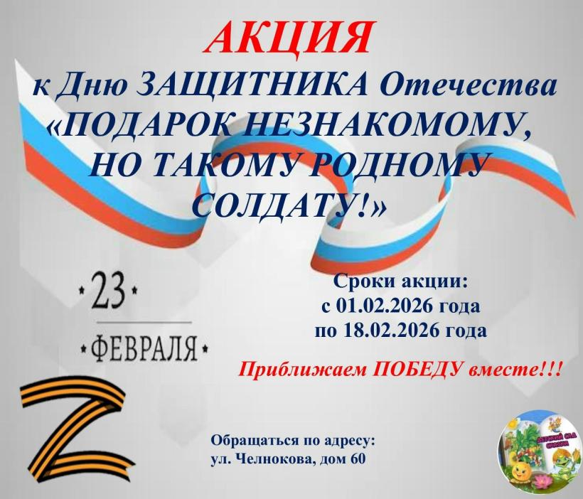 С 01.02.2026 по 18.02.2026 года объявляем Акцию к Дню ЗАЩИТНИКА Отечества " ПОДАРОК НЕЗНАКОМОМУ, НО ТАКОМУ РОДНОМУ СОЛДАТУ!"