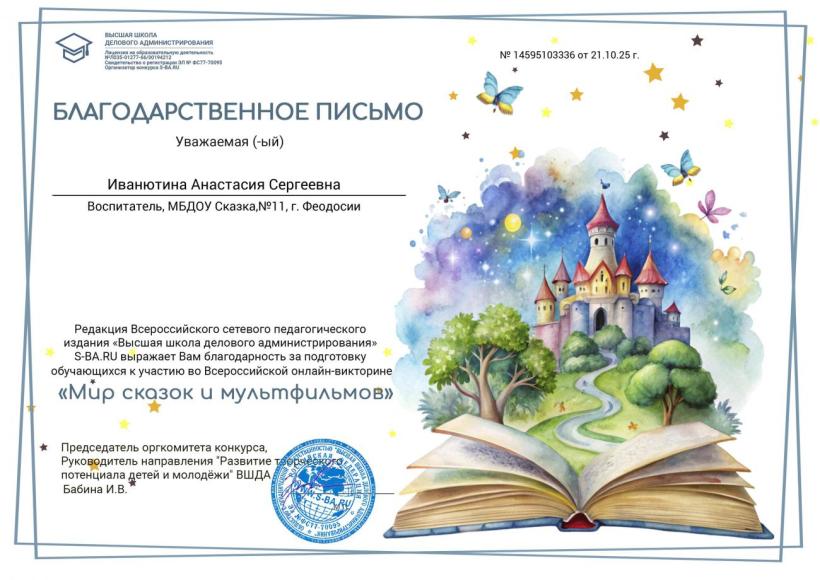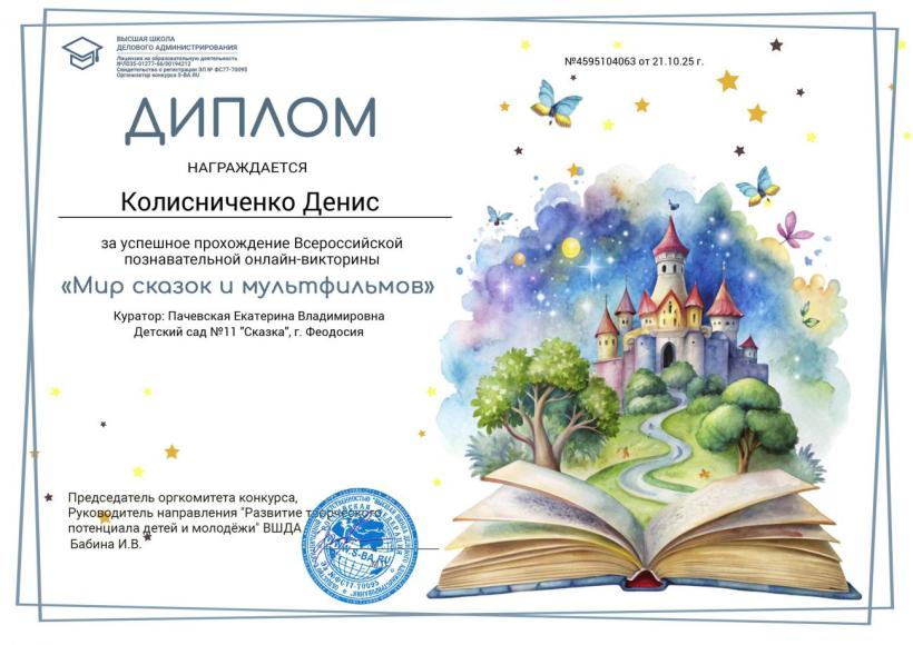 Дипломы за успешное прохождение Всероссийской познавательной онлайн-викторины "Мир сказок и мультфильмов"
