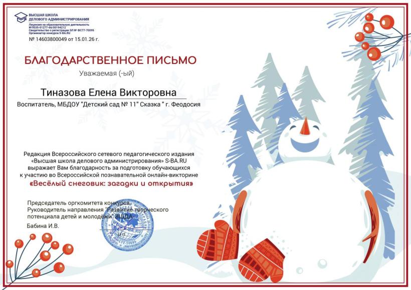 Дипломы за успешное прохождение Всероссийской познавательной онлайн-викторины "Весёлый снеговик: загадки и открытия"