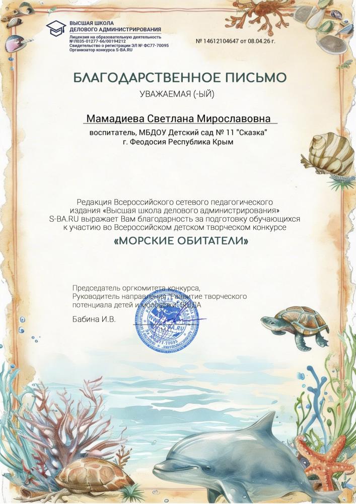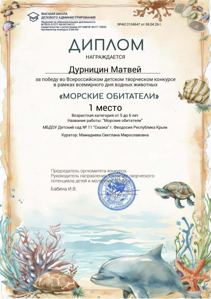 Поздравляем победителей Всероссийского детского творческого конкурса в рамках всемирного дня водных животных "Морские обитатели"