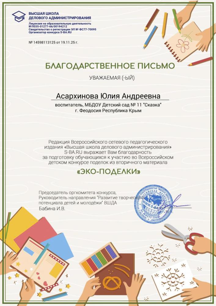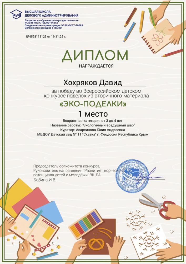 Поздравляем победителя Всероссийского детского конкурса поделок из вторичного материала "Эко-поделки"