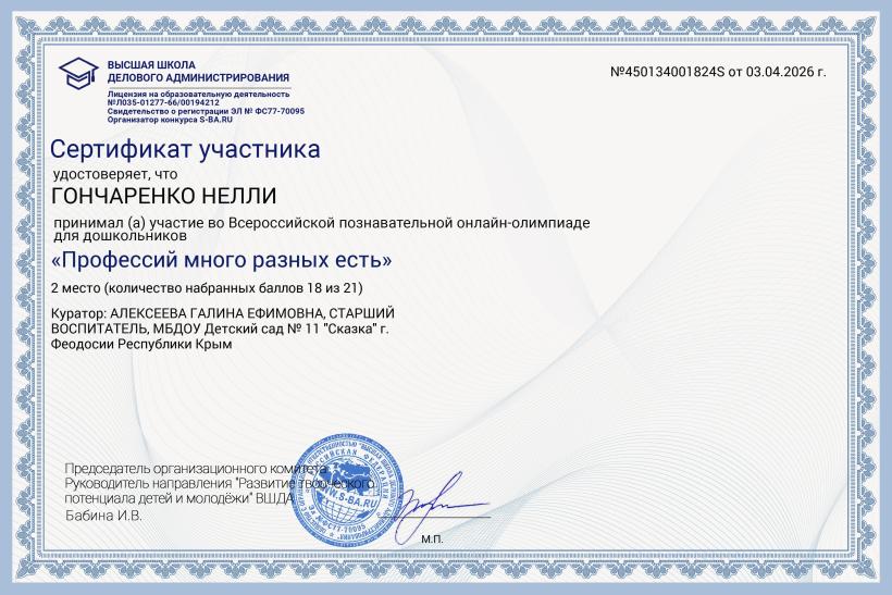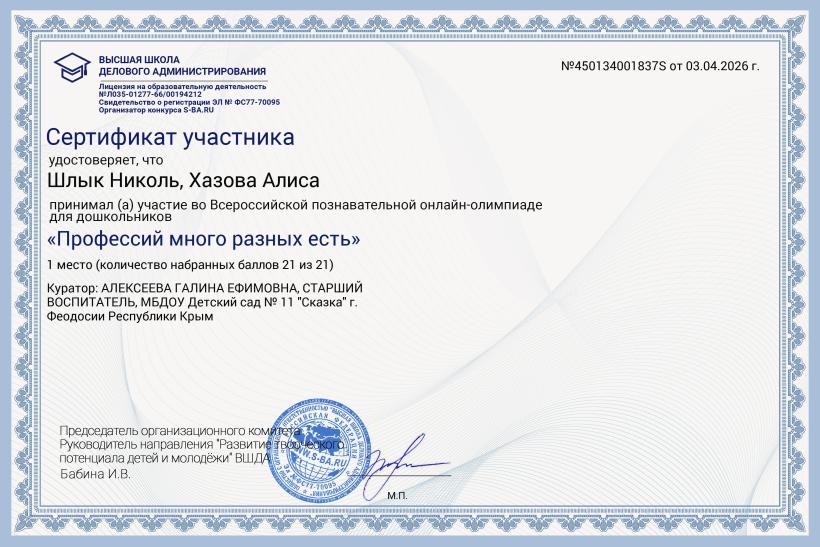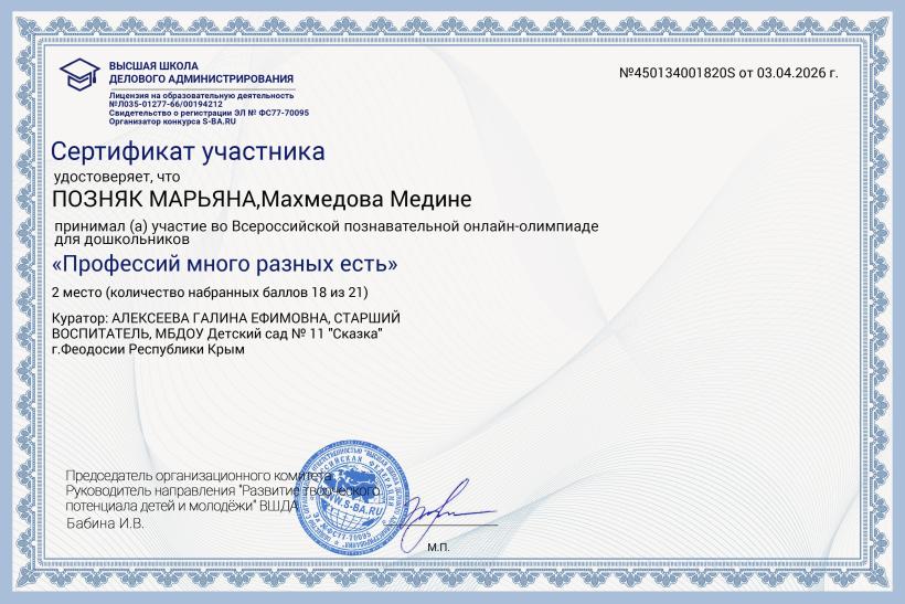 Сертификаты за участие в познавательной онлайн-олимпиаде для дошкольников "Профессий много разных есть"